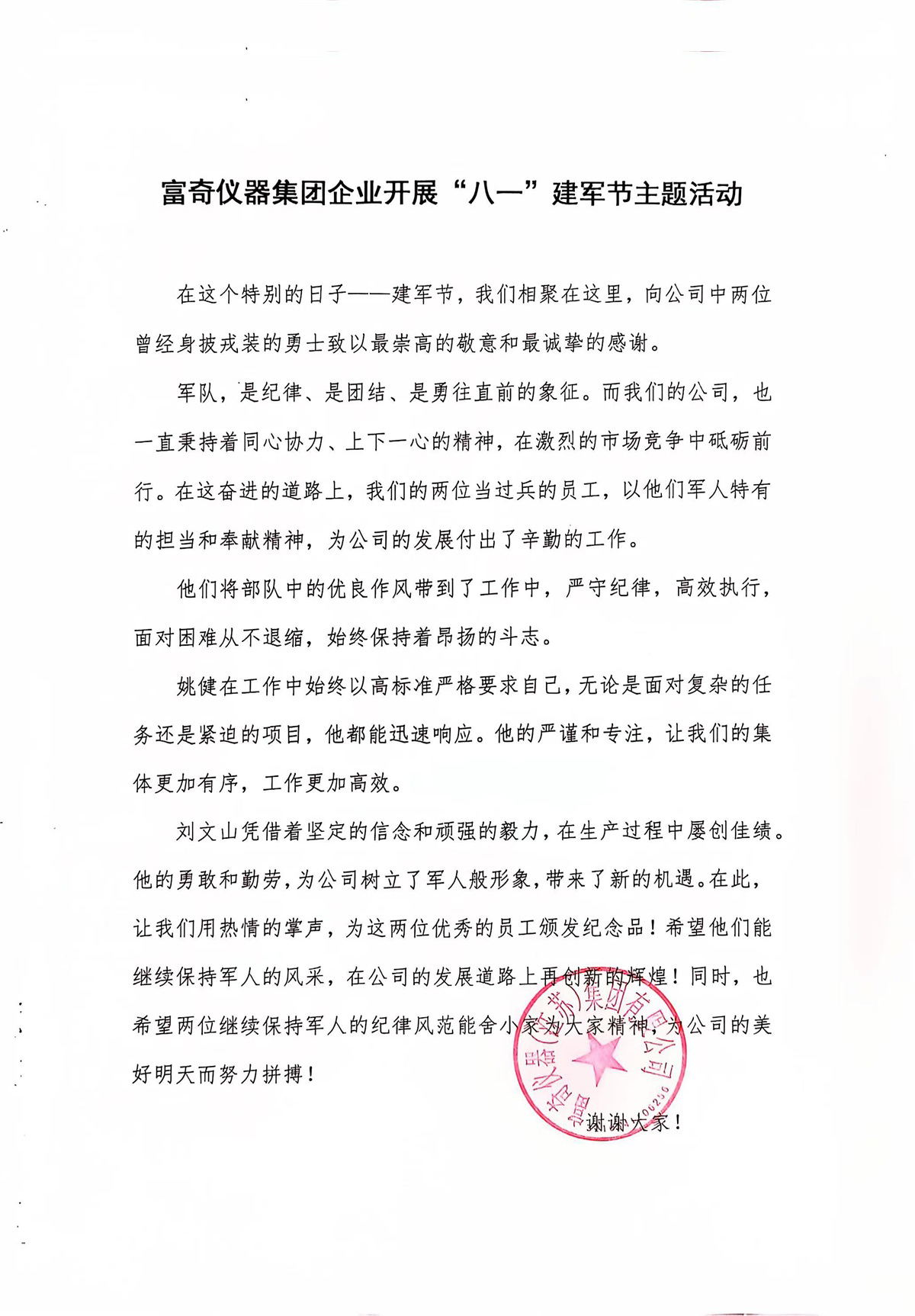 富奇仪器集团企业开展“八一”建军节主题活动