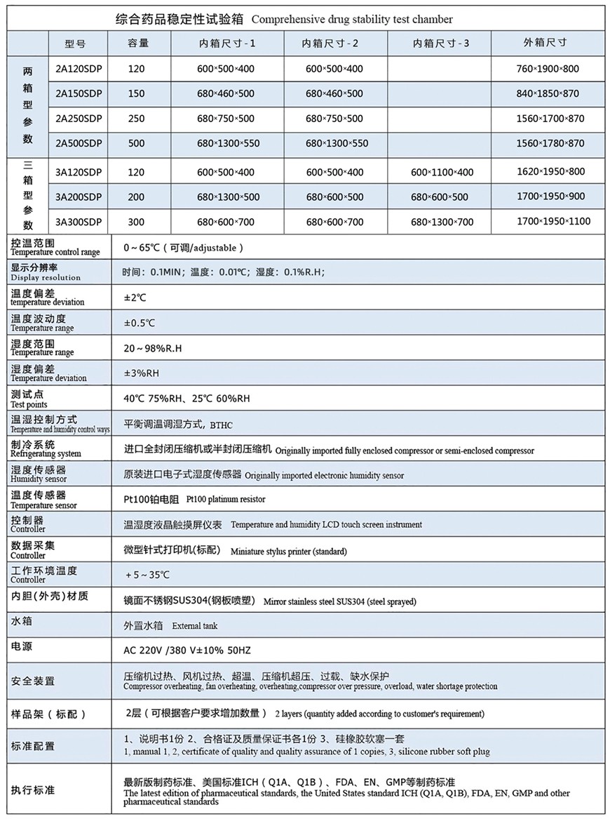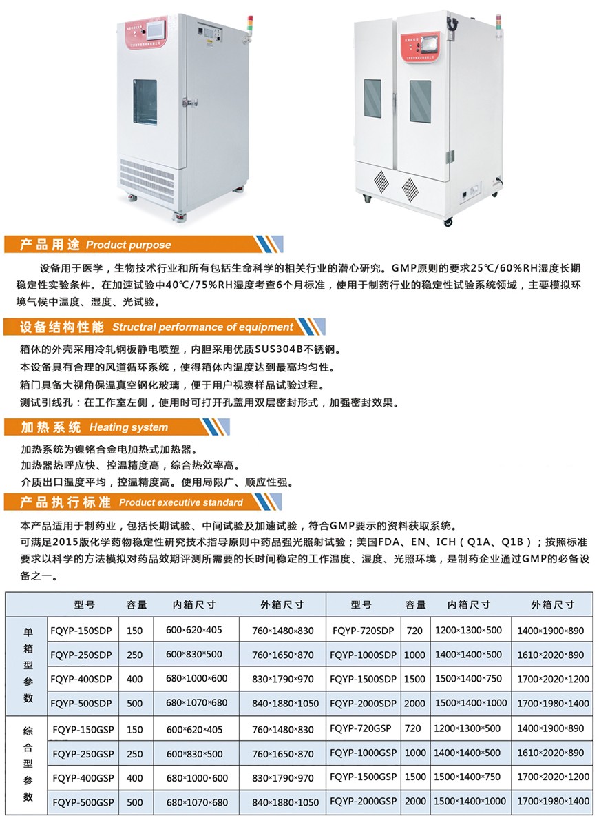 设备用于医学,生物技术行业和所有包括生命科学的相关行业的潜心研究。GMP原则的要求25℃/60%RH湿度长期稳定性实验条件。在加速试验中40℃/75%RH湿度考查6个月标准,使用于制药行业的稳定性试验系统领域,主要模拟环境气候中温度、湿度、光试验。